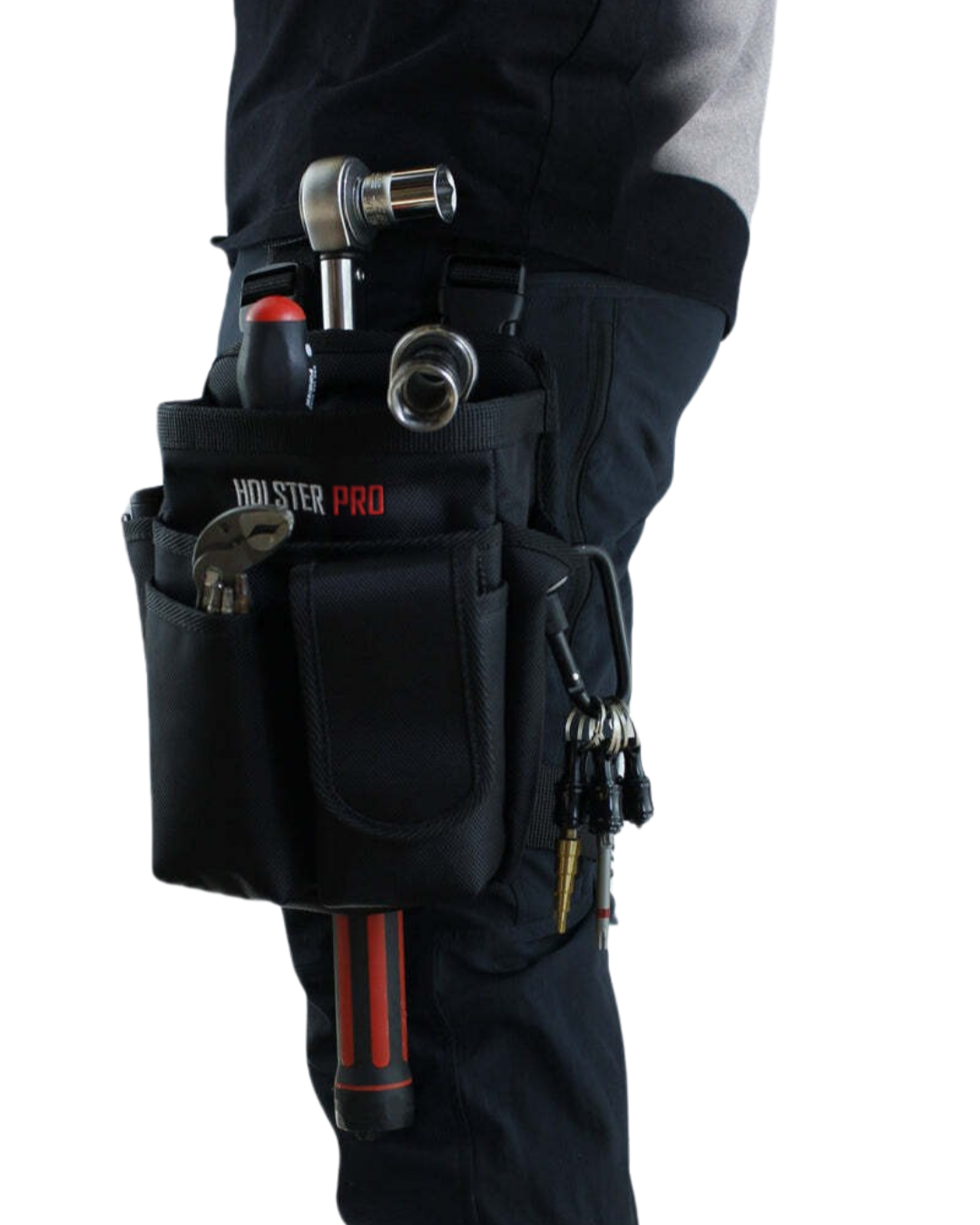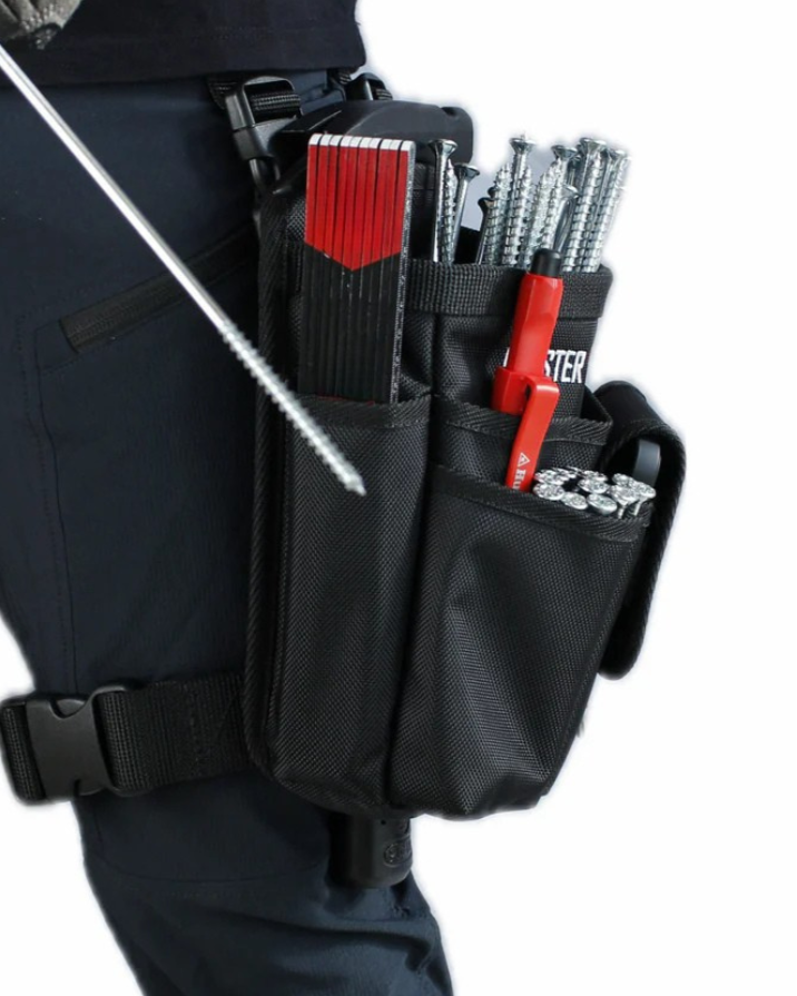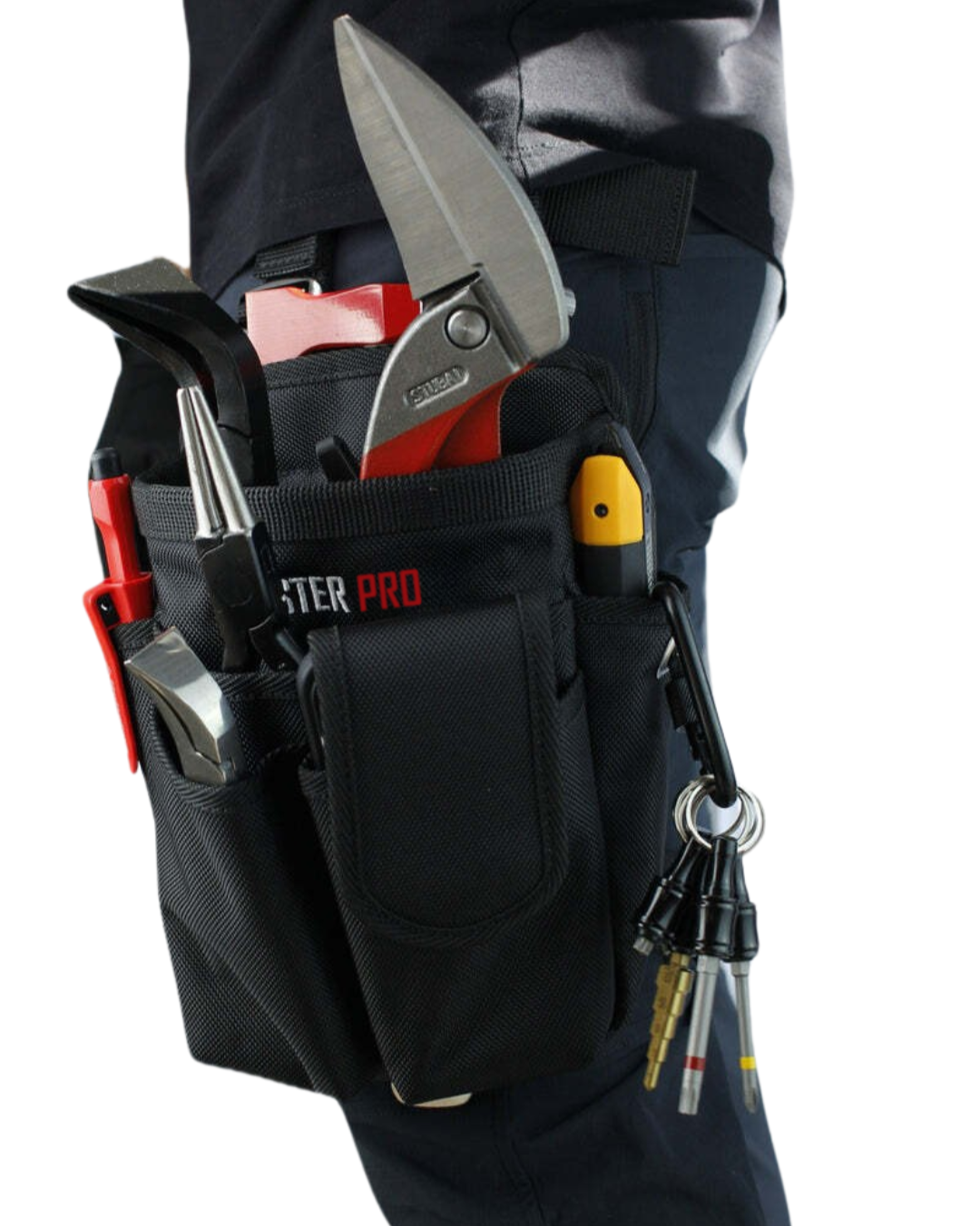 Nuestra funda está diseñada para el bienestar del profesional. A diferencia de las fundas tradicionales que cargan el peso en tu columna, ANCLAJE PRO™ lo distribuye en tus caderas y muslos. Además, sus imanes industriales y bolsillos en ángulo garantizan que tus herramientas nunca se pierdan.