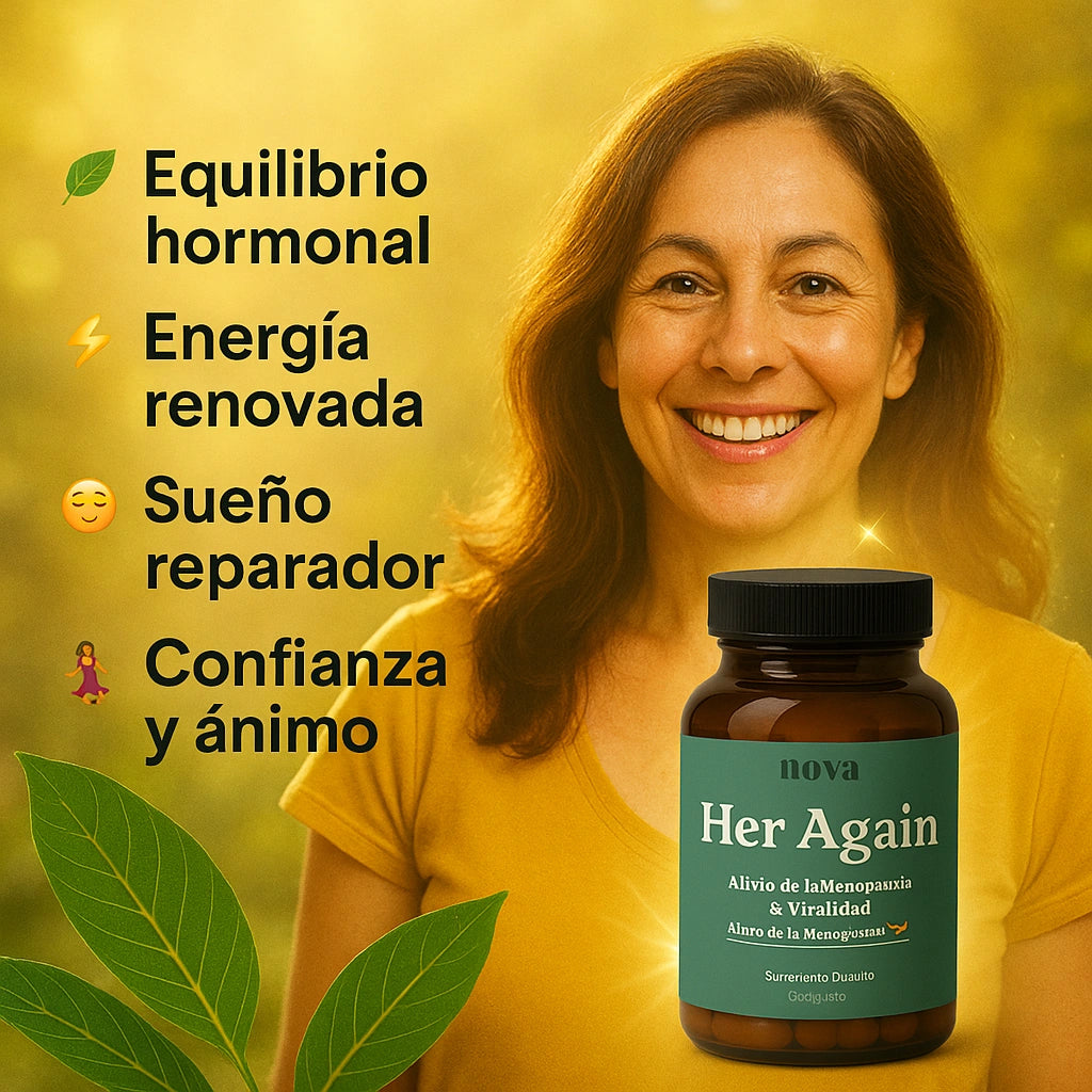 Absolutamente. Her Again combina extractos naturales que ayudan a equilibrar tus hormonas, reduciendo sofocos, irritabilidad y altibajos emocionales.